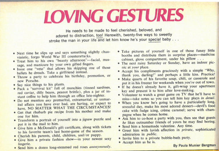 Enter the below article by Paula Munier, a writer, author, and editor who wrote this masterpiece entitled "LOVING GESTURES" for a 1977 edition of Cosmo. (When contacted, Munier said, "I can't imagine how the story holds up these days, as times have changed so much for women over these decades ... or have they?") Well, if the BOLD headline of the article doesn't scare you enough, let me hit you with the subhead: "He needs to be made to feel cherished, beloved, and adored to distraction, too! Herewith, twenty-five ways to sweetly stroke the man in your life and let him know he's your special baby…" Woof.